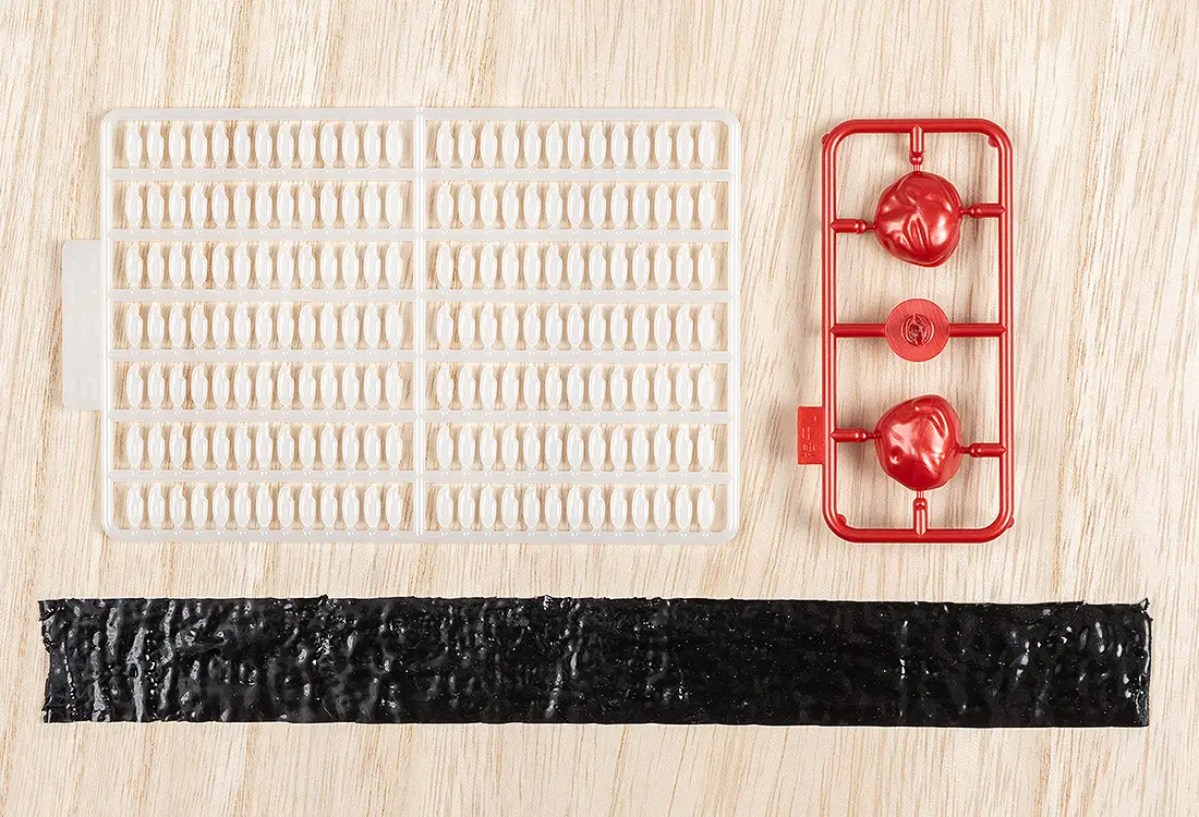 Este kit contém 1456 peças de grãos de arroz, bem como uma folha de alga flexível e um umeboshi para colocar no meio; são necessárias cola e alicates para a montagem.