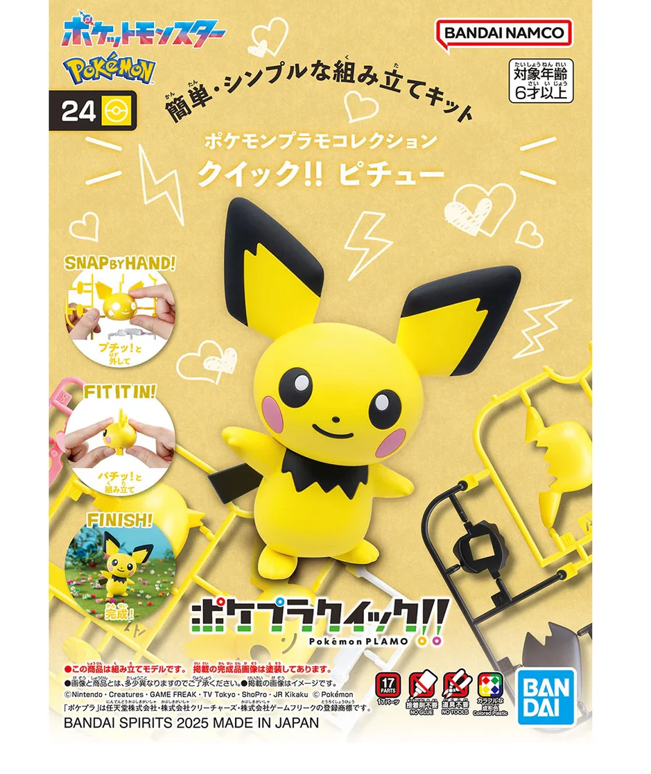 Pichu junta-se à série de kits de modelos “Pokémon Plamo Quick!!” da Bandai, que podem ser facilmente montados mesmo por iniciantes, sem a necessidade de ferramentas!